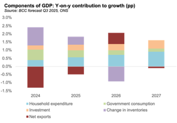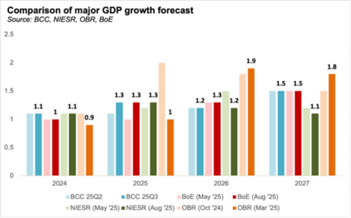 However, beyond 2025, the outlook begins to diverge slightly. The BCC expects GDP to rise by 1.2 per cent in 2026, which remains in line with NIESR, before a modest pick-up to 1.5 per cent in 2027. NIESR turns more pessimistic for 2027, forecasting growth of just 1.1 per cent. The BoE is slightly more optimistic, forecasting 1.3 per cent in 2026 before an uptick to 1.5 per cent in 2027. By contrast, the Office for Budget Responsibility (OBR) remains an outlier, projecting much stronger growth of 1.9 per cent in 2026 and 1.8 per cent in 2027.